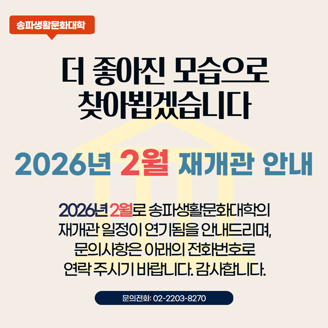 ¼¿ï ¼ÛÆÄ±¸ ¹éÁ¦°íºÐ·Î 242 ¼ÛÆÄ±¸¹Îȸ°ü 2Ãþ ´ëÇ¥ÀüÈ : 02-2203-8270 COPYRIGHT (C) 2020 SONGPA LIVING CULTURE CENTER ALL RIGHTS RESERVED.